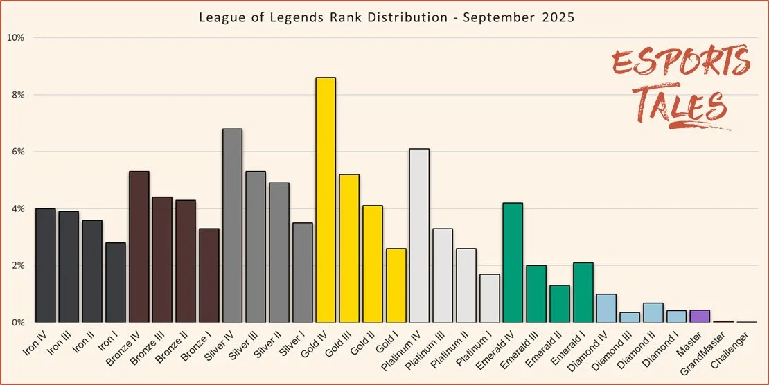 The rank distribution and percentage of players by tier in League of Legends in September 2025, Season 3, Trials of Twilight. The entire player base in all regions is considered. Only solo queue data.
